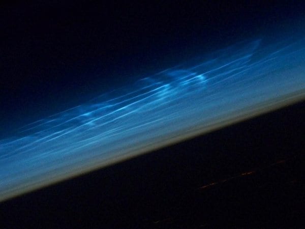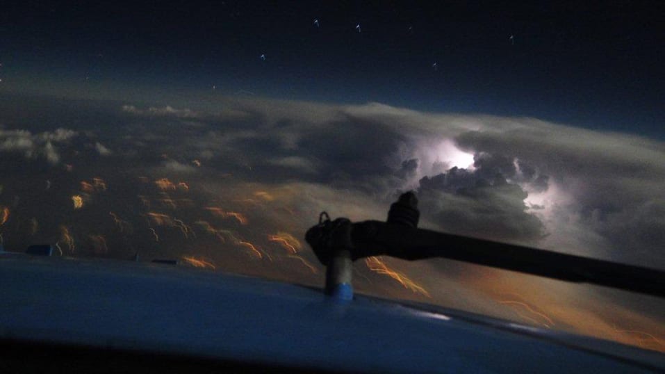 Taken from a B737-800. The black object is part of the windscreen wiper assembly. Photo exposure about 15 seconds (we’re moving at 500mph and bouncing around so there is some blurring.
