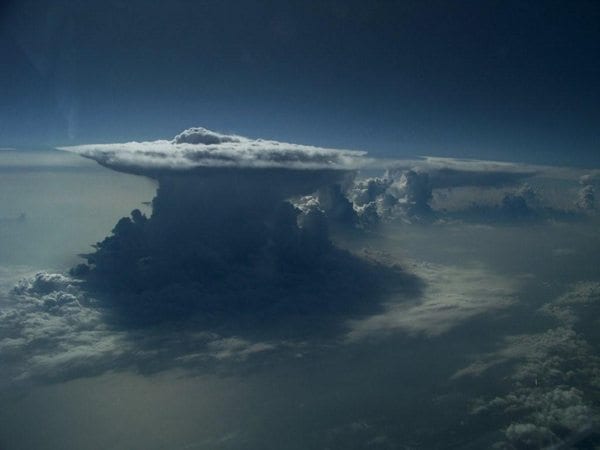 A view from the flight deck at 36.000 feet of storms over Hungary.