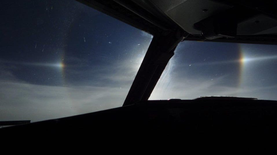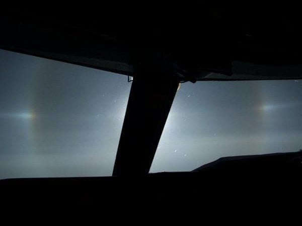 One thought on “Pilots eye view of Halo and Sundogs at 33,000ft., above The Bay of Biscay, as seen from Captain Richards office window.”