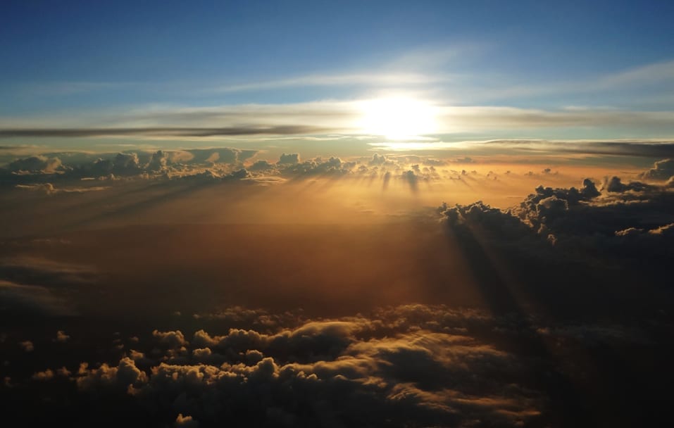 A sunrise viewed from the flight deck at 20,000 ft over Lincolnshire, UK.
