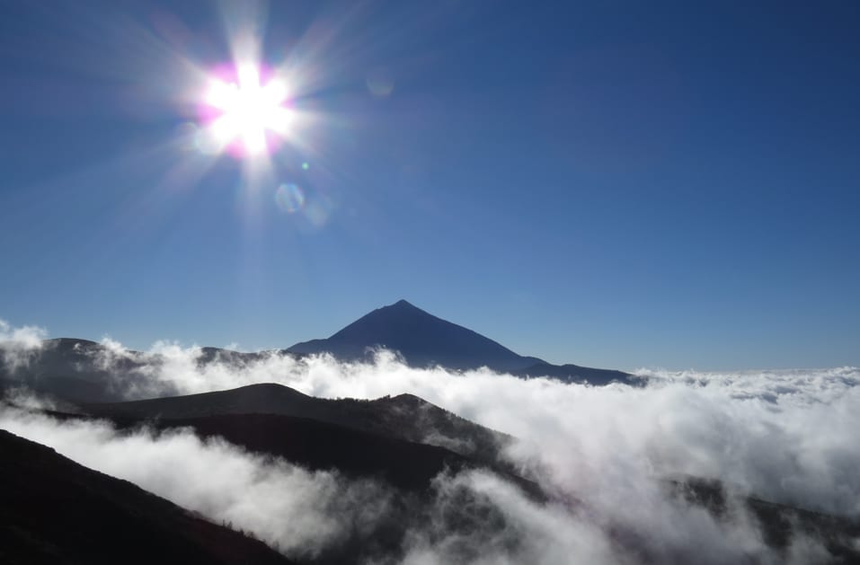 A view of Mount Teide surrounded by clouds on the island of Tenerife.