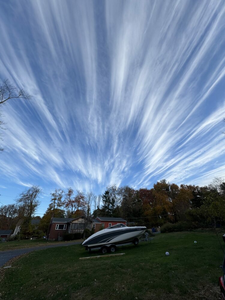 Cirrus fibratus radiatus spotted over Middle Bolton Lake, Bolton, Connecticut, US