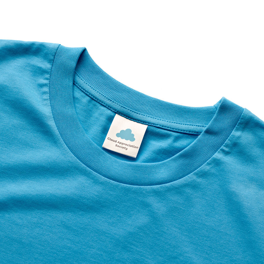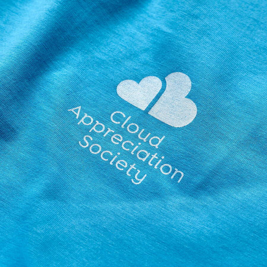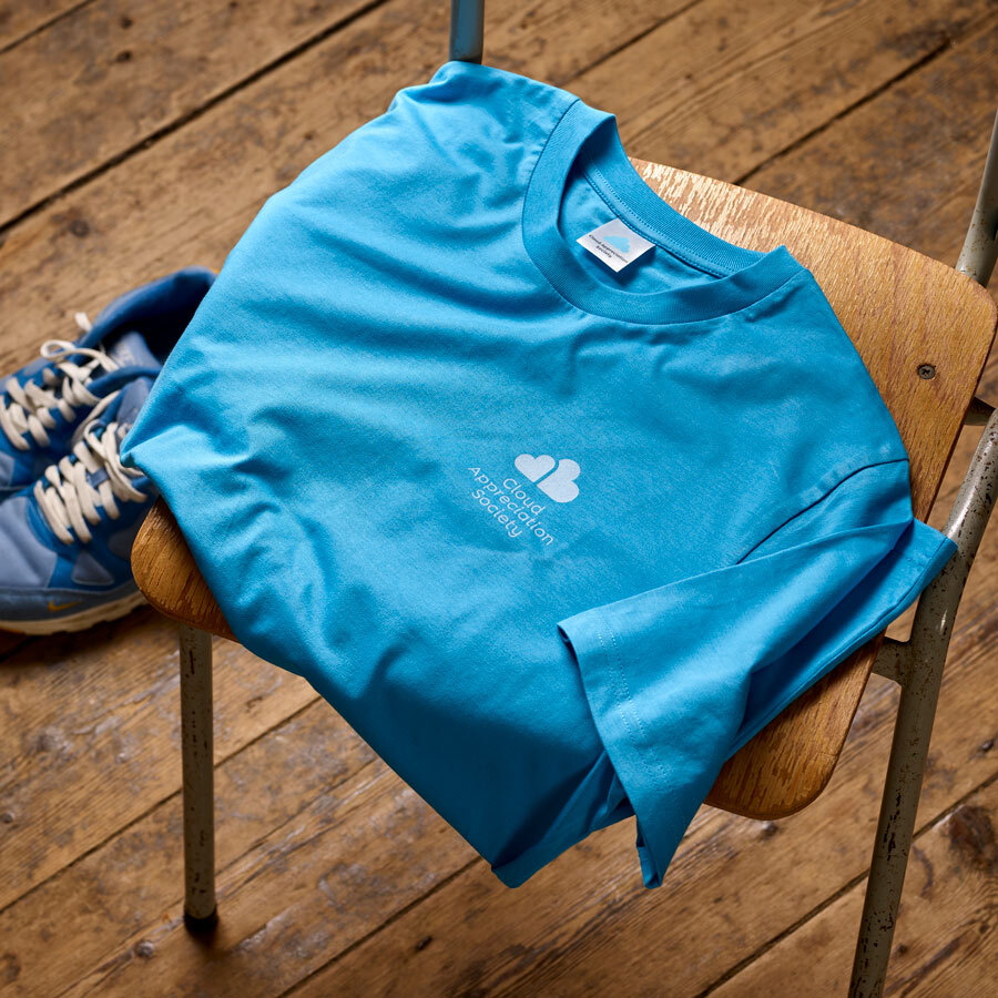 Our super-stylish Cloud Appreciation Society shirts with our logo printed in pale blue on aqua blue tees are made with ring-spun combed 100% organic cotton producing a soft and comfortable fabric.