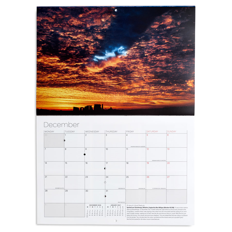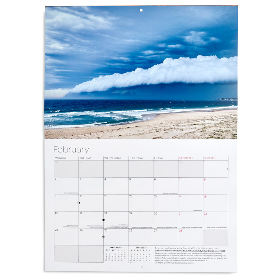 Beautifully printed on environmentally friendly paper, the calendar lists public holidays and celebration days for many countries, as well as showing phases of the moon. Our 2026 Cloud Calendar is an ideal gift for cloudspotters and sky lovers of all ages.