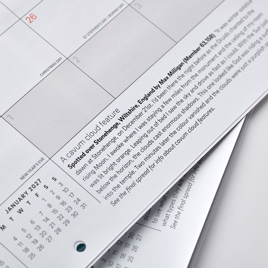 Each year, we produce a calendar of our favourite images from the Cloud Appreciation Society photo gallery. The 2026 Cloud Calendar is an absolute gem. Every month features a stunning cloudscape photographed by a member of the Cloud Appreciation Society. These glorious images of dramatic cloud formations and atmospheric optical effects are accompanied by brief accounts from the members of what inspired them to notice the sky that day, and at the back of the calendar is a spread with our explanations of the cloud formations and why they look the way they do.