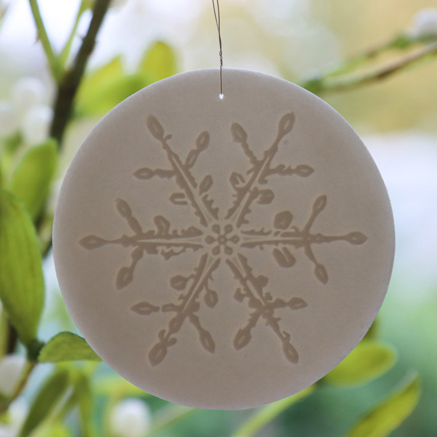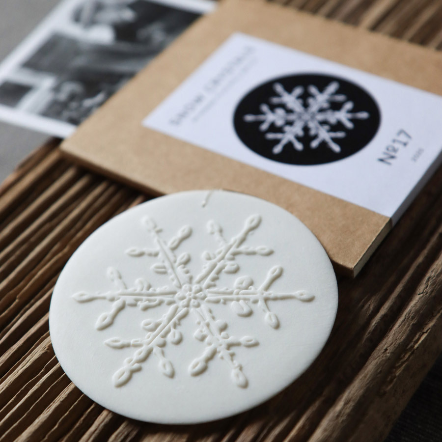 Each year, Doris selects six different snow crystals from the photos made by Wilson A. Bentley. These are turned into graphic illustrations which are both close to nature and artistically rendered. These illustrations form the basis for shaped plaster models, which are carefully brushed with liquid porcelain in several layers. After it is fired in a kiln, the porcelain acquires a breath-taking translucency. Viewed against a backlight or under a sidelight, the snow crystals convey an impression of lightness, delicacy, even weightlessness.