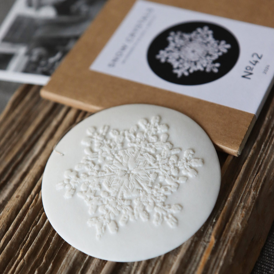 These beautiful snow crystals have been crafted in porcelain by Doris Borden and are a homage to Wilson A. Bentley and his life‘s work. In 1885, this young naturalist and pioneer of photography became the first to take detailed photographs of snow crystals under his microscope. Born in 1865 as the son of a Farmer in the north-eastern state of Vermont (USA), he had developed, in an autodidactic and experimental process, a special method for this task. Bentley was so captivated by this world of transitory crystals, with its geometric beauty and boundless variety, that he dedicated his life to their study.