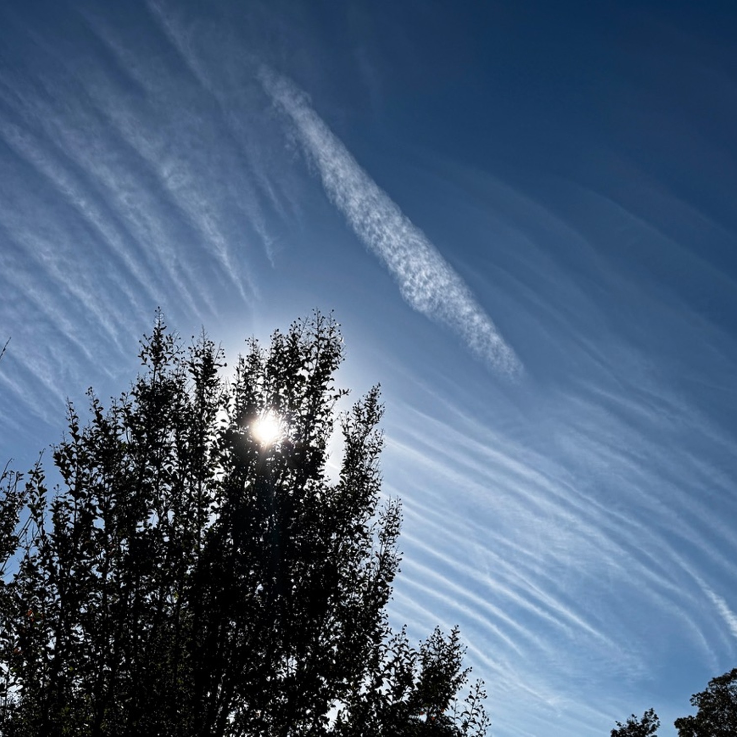 We think they’re too high to have been shaped by the nearby mountains since this is the high ice-crystal layer cloud Cirrostratus that’s in the form known as fibratus. That is when the winds have stretched it into long, fine parallel filaments, like hair combed neatly across the sky. The tidy hairdo is only marred by the Cirrocumulus in the middle, which looks like a bad toupée trying to cover a bald patch.