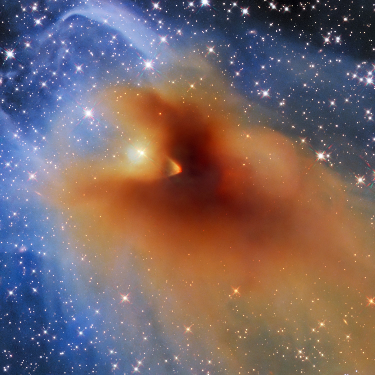 While the clouds of Earth are composed of water droplets and ice crystals, those out in the cosmos are made of different stuff entirely. Scattered throughout most galaxies are interstellar clouds made of dust and gases – like this one, CB 130-3, spotted by the NASA/ESA Hubble Space Telescope in the direction of the constellation Serpens. It is a particularly dense cloud – an object known as a dense core – and it is where a new star is in the process of being born.